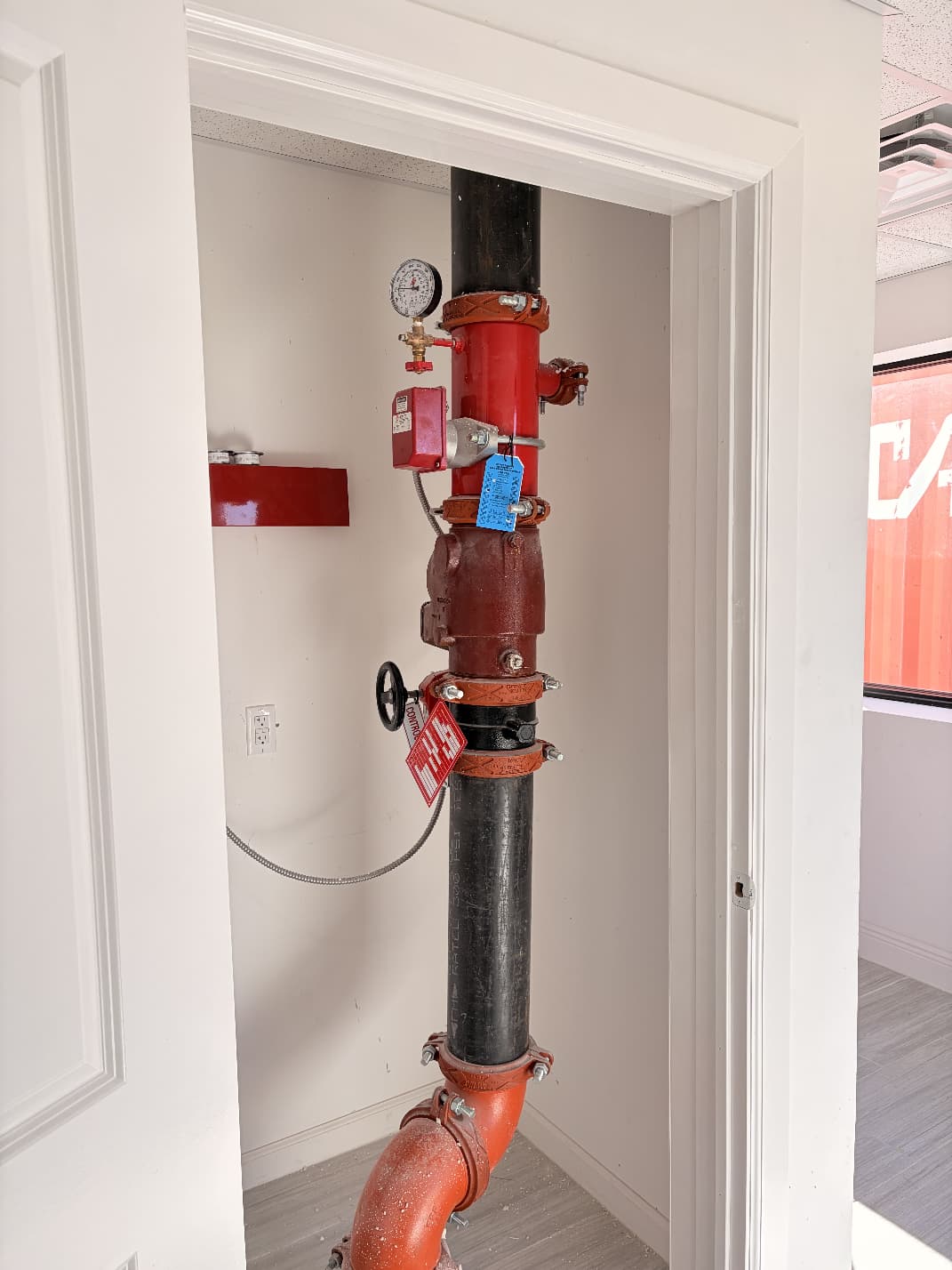 Completed tamper switch tie-ins to monitor sprinkler valve status. Completed flow switch tie-ins to detect water flow from the sprinkler system.